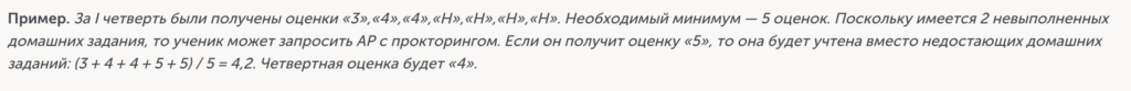 Для того, чтобы получить оценку по всем предметам за четверть необходимо выполнить минимальное количество д/з. То есть все домашки выполнять не обязательно, главное сделать необходимый минимум для аттестации. Если конкретно, то в маленьких четвертях-1-й,2-й и 4-й и семи предложенных для выполнения д/з по основным предметам достаточно закрыть пять. В большой четверти- 3-ей, из предложенных девяти домашек необходимо выполнить семь. При этом среди закрытых д/з без вариантов должны быть обязательные (помечены «!»).