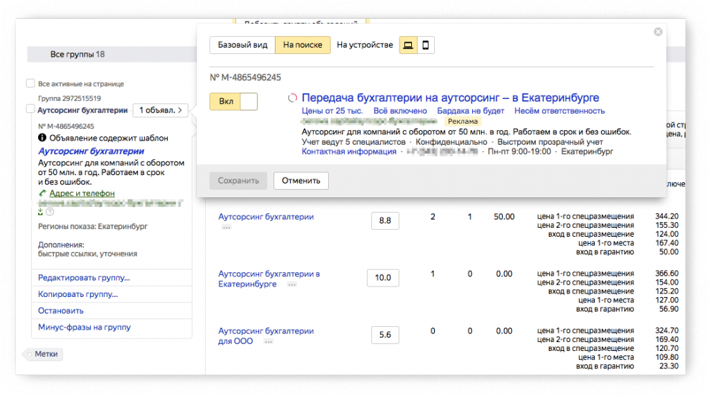 - объедините схожие по смыслу группы объявлений — например, с ключами «цена» и «стоимость». Чтобы сохранить релевантность, используйте шаблоны;
