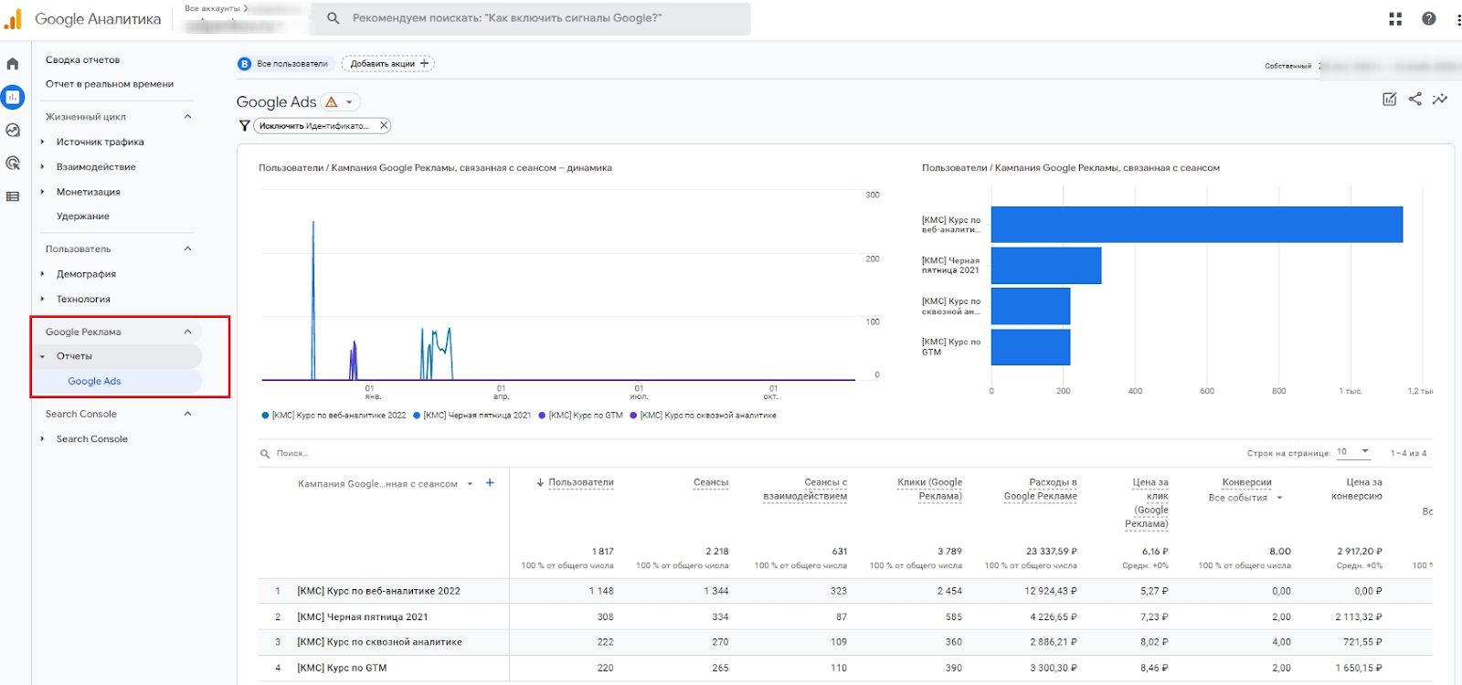 GA4 предоставляет развернутую статистику по просмотрам и поведению пользователей на сайте, также здесь можно посмотреть отчеты об эффективности запущенных рекламных кампаний в Google Ads.