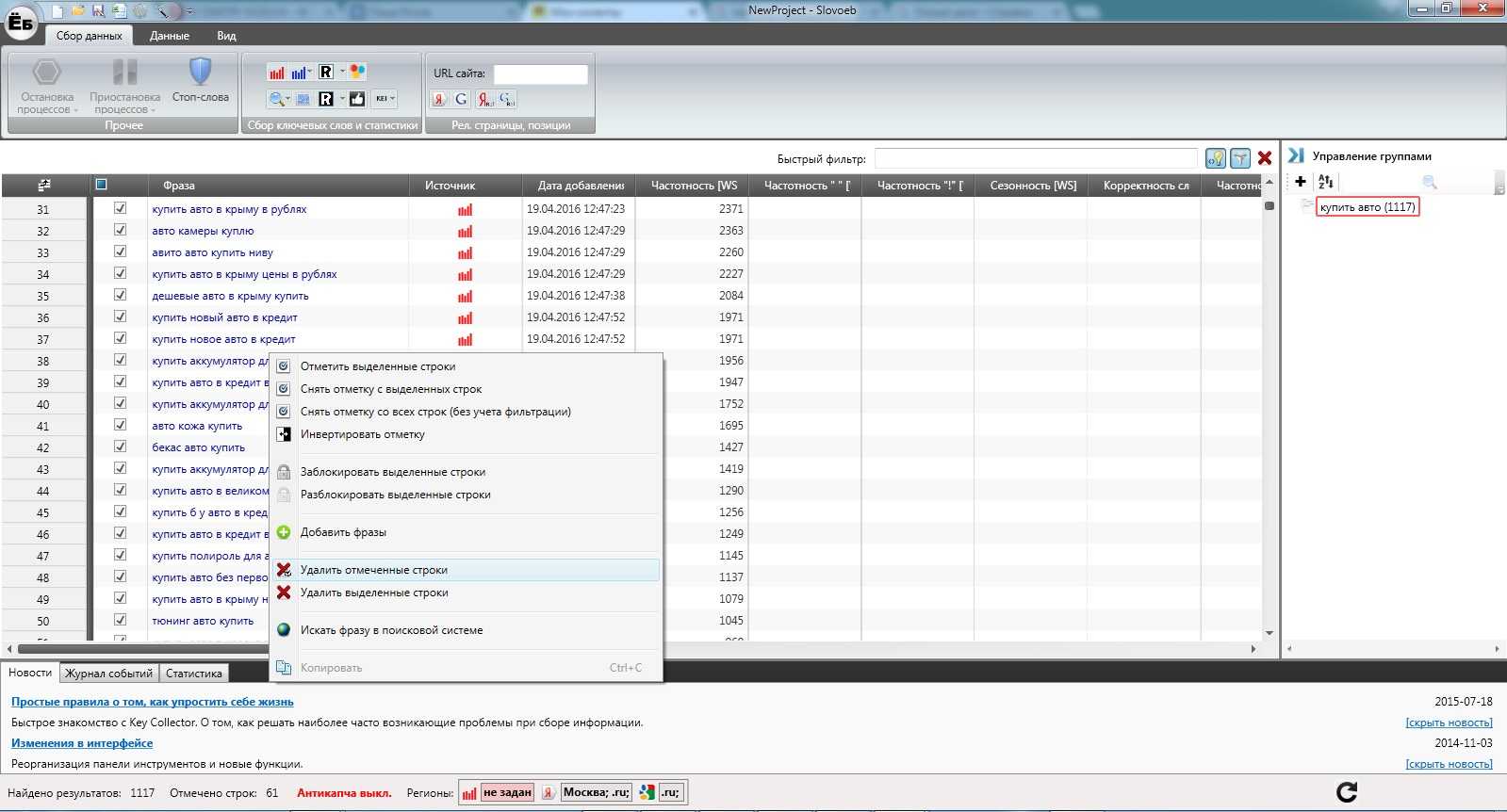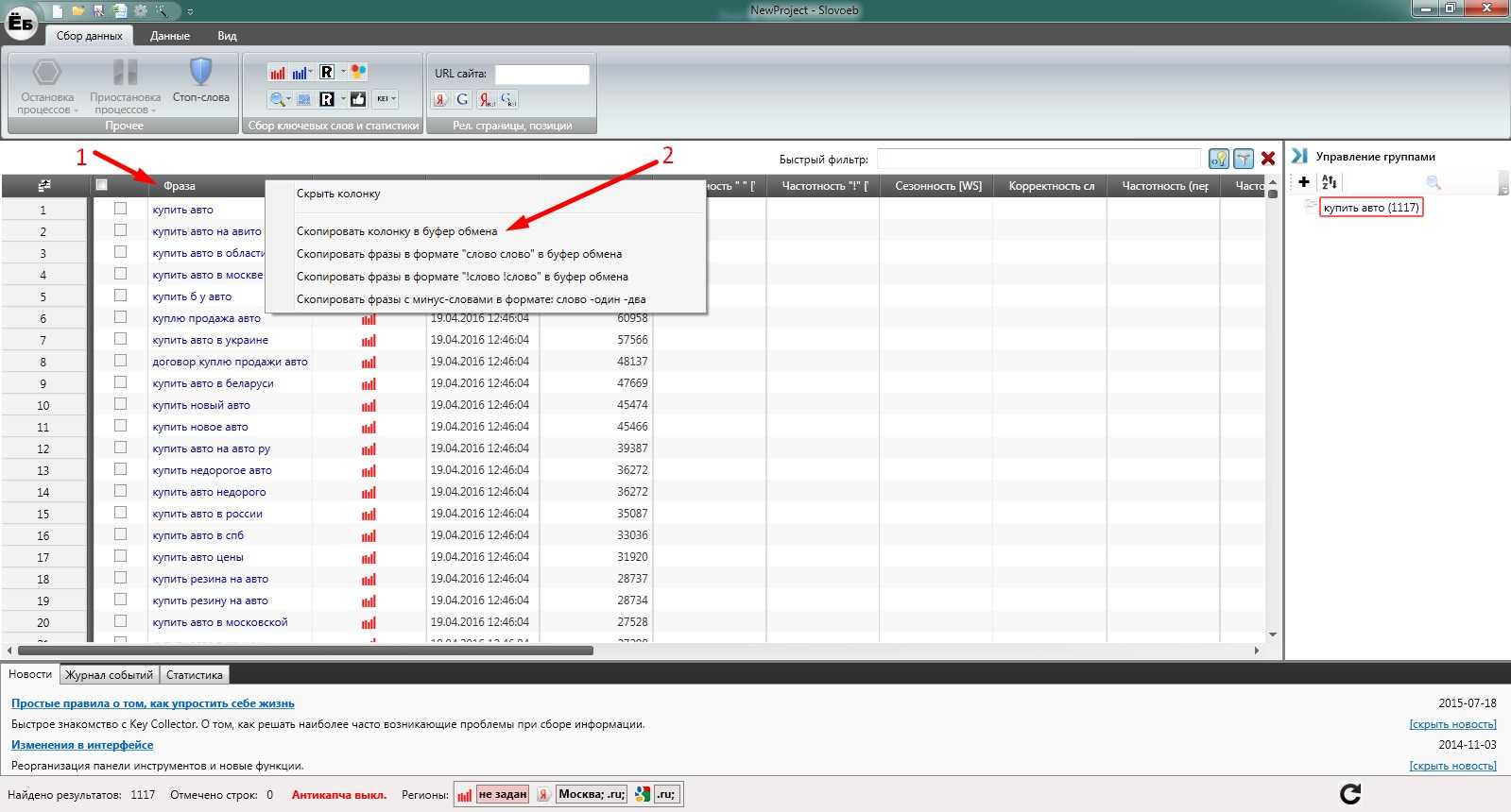 Перед парсингом не забудьте выбрать регион. Ведь запросы в разных регионах обладают разной частотностью.