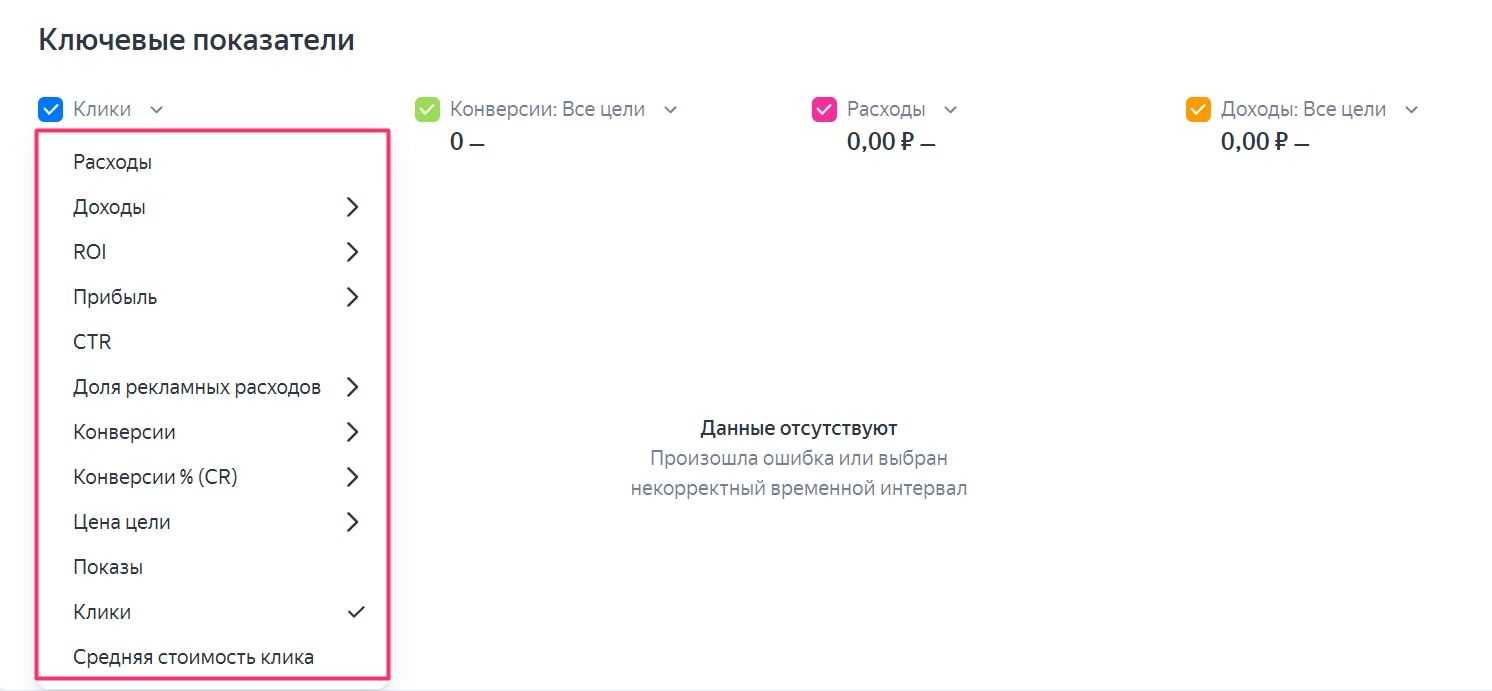 В разделе «Ключевые показатели» можно отслеживать статистику по расходам и доходам, кликам, показам, конверсиям, CTR (кликабельность объявления) и прочим важным показателям. Все метрики важны и показывают, насколько эффективна рекламная кампания