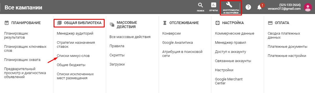 Для добавления минус-слов следует открыть меню «Инструменты и настройки» и кликнуть по кнопке «Списки минус-слов», которая находится в подменю «Общая библиотека».