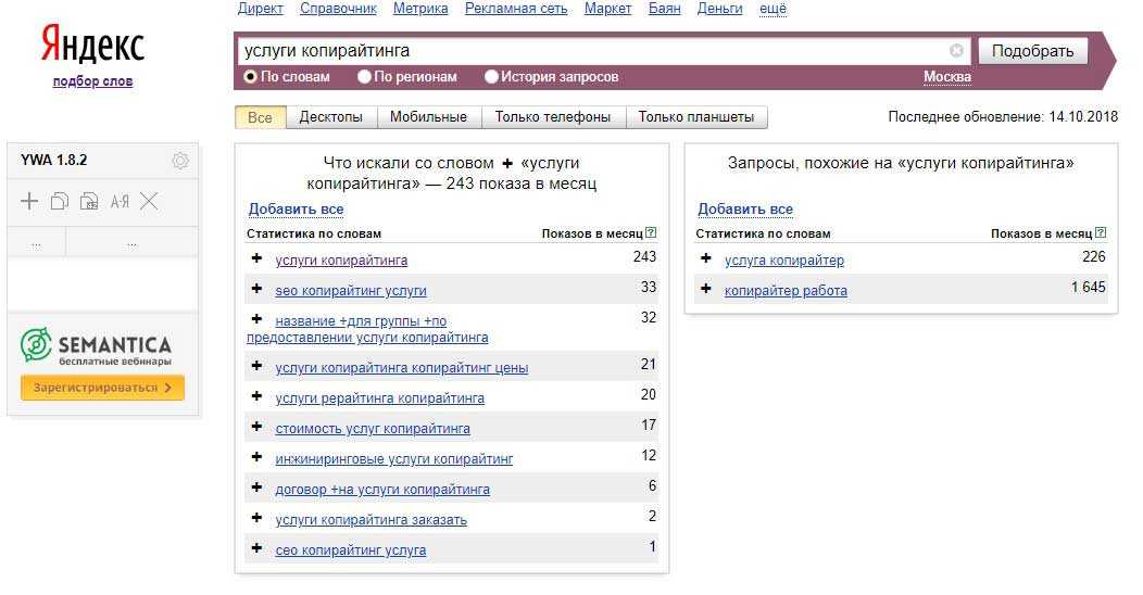 Почему мы не берем более общие запросы, например, «копирайтинг» или «копирайтер»? Дело в том, что по таким запросам могут искать не только услуги копирайтера, а много другой информации. Например, что такое копирайтинг, как на нем заработать, обучение копирайтингу и многое другое. Поэтому старайтесь максимально конкретизировать запрос.