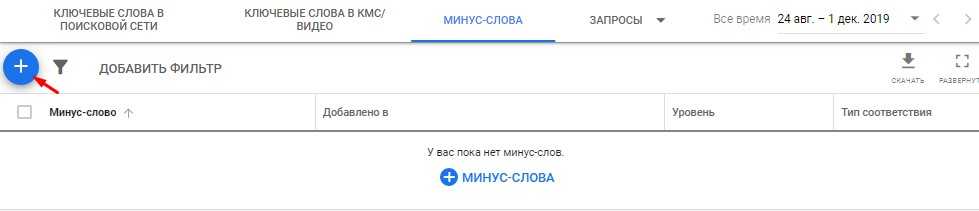 Сверху появится несколько вкладок, нам нужна «Минус-слова».