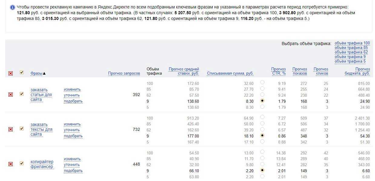 В прогнозе есть еще один интересный и важный столбец – «объем трафика». Он может иметь значения 100, 85, 62, 9, 5, иногда – другие. Что это такое? Это тот объем трафика, который вы хотите выкупать. От него будет зависеть ставка (чем больше объем трафика, тем выше ставка). Например, если вы хотите получать, условно говоря, весь трафик, то выбираете 100. Если вам достаточно небольшого объема, выбираете 9 или даже 5. В зависимости от выбранного объема меняется ставка.