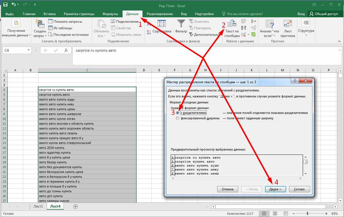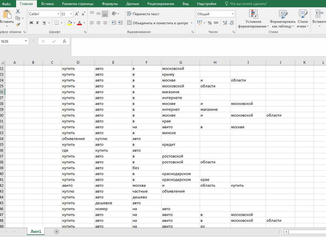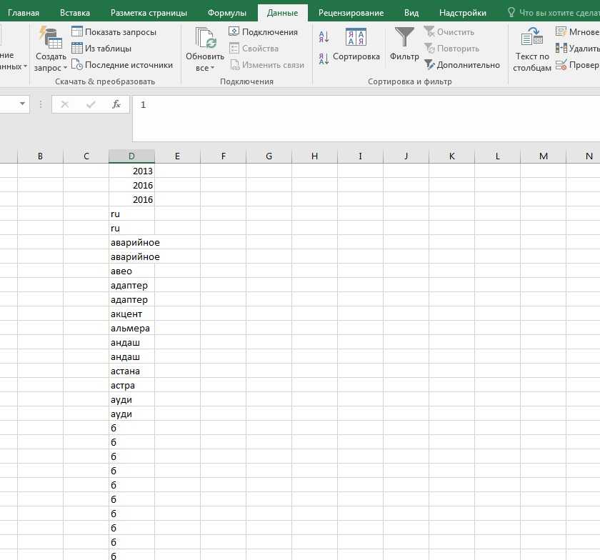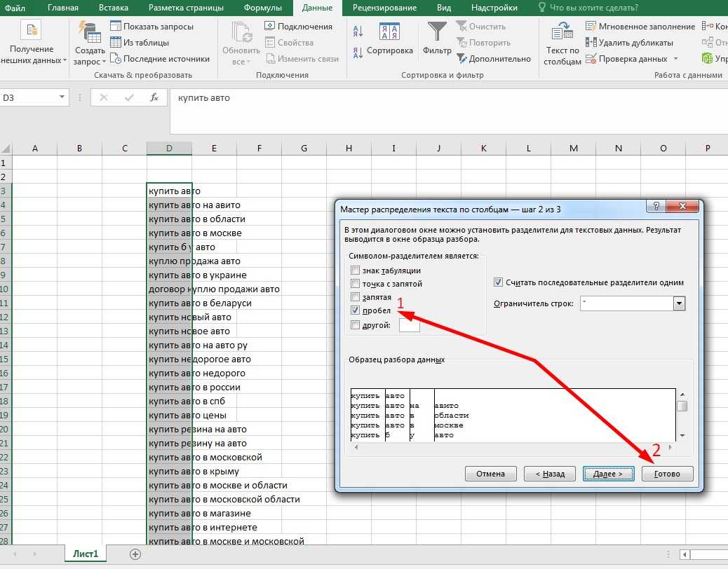 - При выделенном списке словосочетаний в Excel переходим во вкладку «Данные».