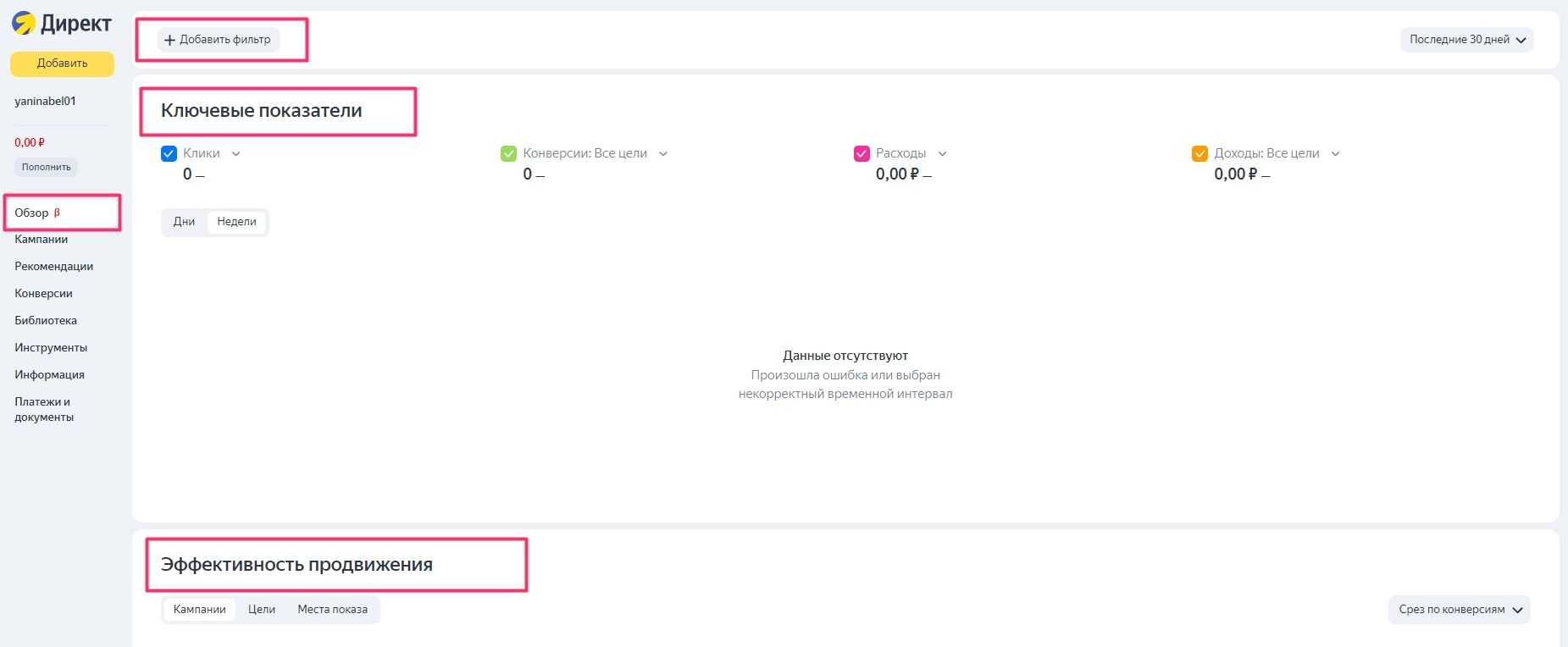 Когда появится первая статистика по объявлениям, можно приступать к анализу РК. Для отслеживания показателей эффективности перейдите на вкладку «Обзор» в кабинете Яндекс Директ.