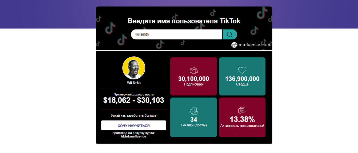Для получения примера дохода на данном сервисе можно ввести в поисковую строку никнейм популярного тиктокера. После проведения поиска по нику будет предоставлена информация по профилю и стоимости заработка за одно рекламное видео. После можно сопоставить реальную информацию о заработке, которая обычно публикуется в различных СМИ, с данными, предоставленными калькулятором.