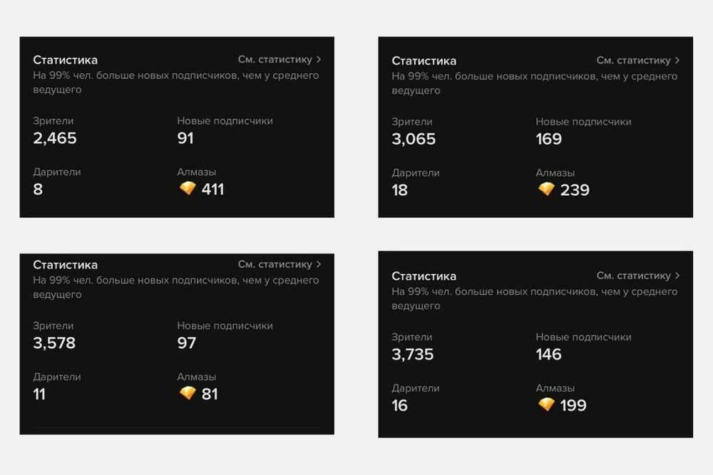 Данные по четырем эфирам. Количество алмазов зависит не от числа зрителей или дарителей. Главное – сколько зритель задонатил блогеру