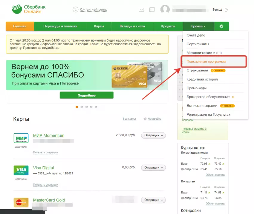 Для этого необходимо в Сбербанк-онлайн в верхнем меню «Прочее» выбрать «Пенсионные программы».