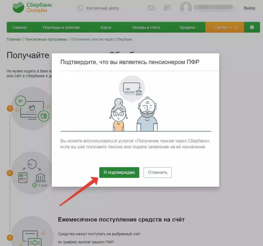 Далее необходимо будет подтвердить, что Вы пенсионер, нажав соответствующую кнопку. А также внизу страницы кликнуть на кнопку «Оформить получение пенсии».