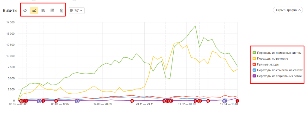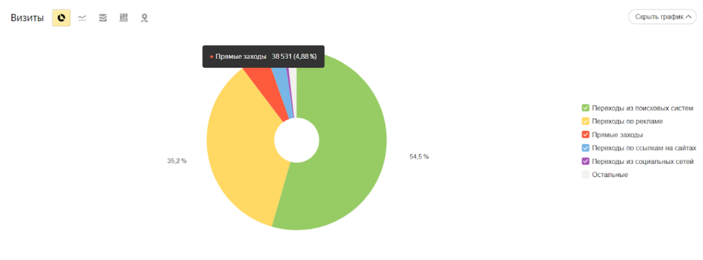 Над графиком — кнопки переключения вида отображения данных (круговая диаграмма, линейный график и другие варианты). В блоке справа — список источников, которые отображены на графике. Их можно отключить, к примеру, оставив на графике только прямые заходы.