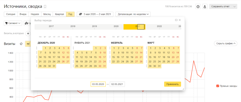 Вы можете переключаться между разными типами графиков, в зависимости от цели анализа. Например, чтобы проанализировать, как менялось количество прямых заходов на протяжении определенного периода, оптимально выбрать линейный график. На нем сразу можно увидеть наличие или отсутствие тенденций, среднее значение, всплески и спады.