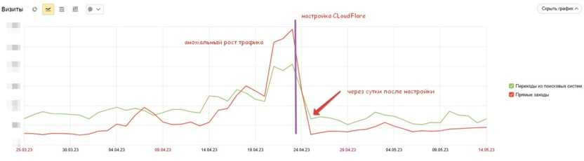 Мы подключили Cloudflare к части проектов, заметив аномальный рост трафика не только по прямым заходам, но и по ПС. На скрине ниже видно, что стартовые настройки снизили трафик практически до первоначальных показателей через сутки.