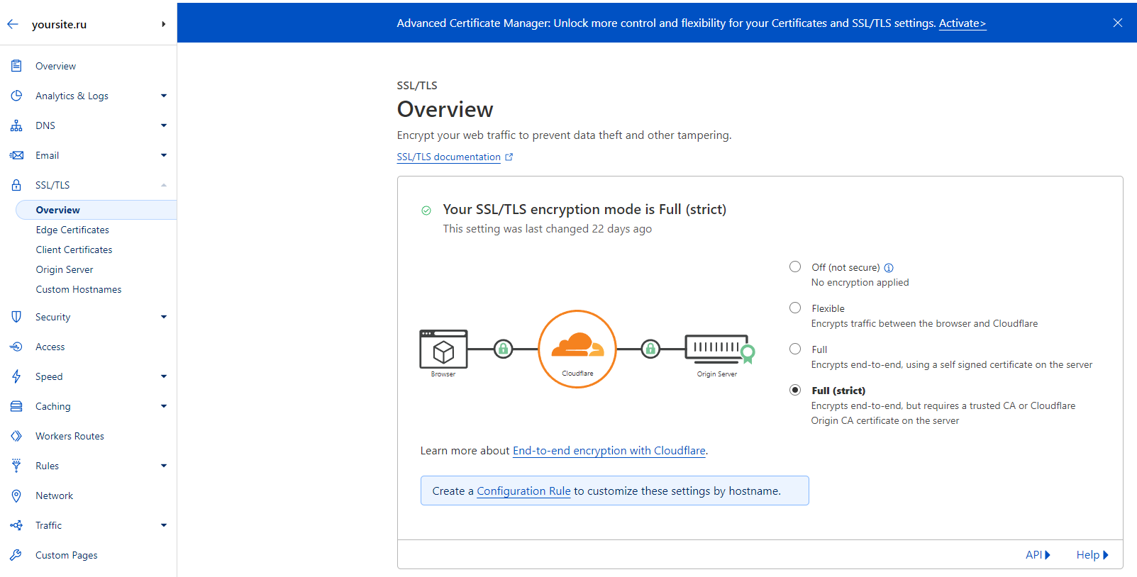 В подобных случаях рекомендуется перейти в раздел “SSL/TLS” -> “Overview” и включить настройку SSL-сертификата Full (strict), как выбрано на картинке ниже.