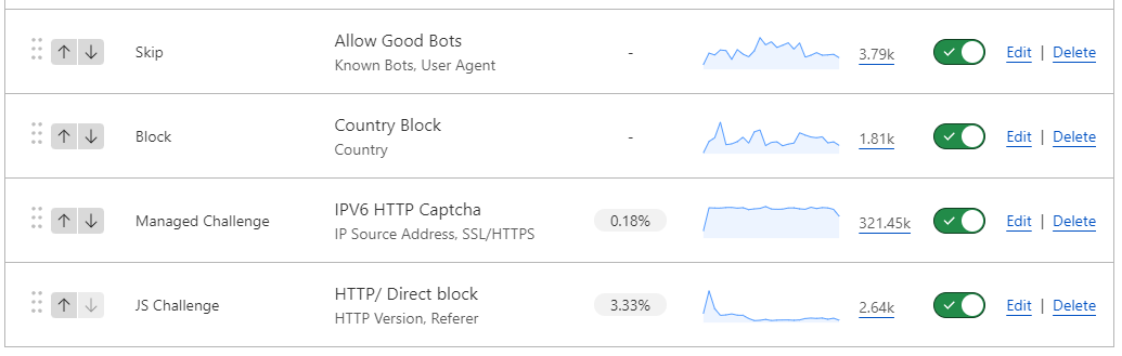 В нашем примере есть правило, которое за время работы заблокировало 321 000 заходов. И из этого количества лишь 0.18% (то есть менее одного процента) были посетители, которые смогли пройти проверку и дальше перейти на сайт.