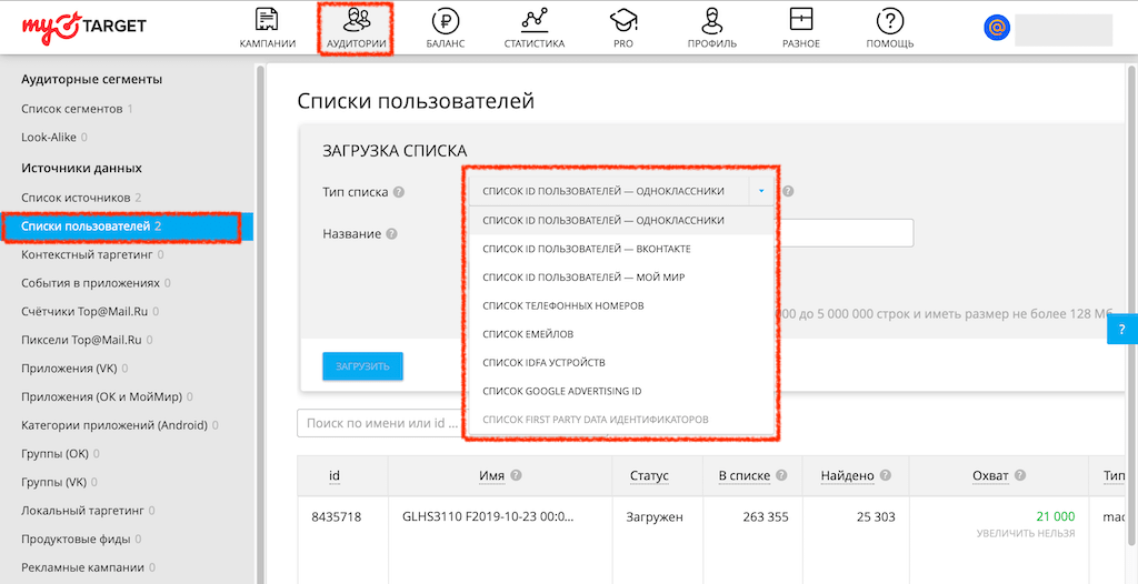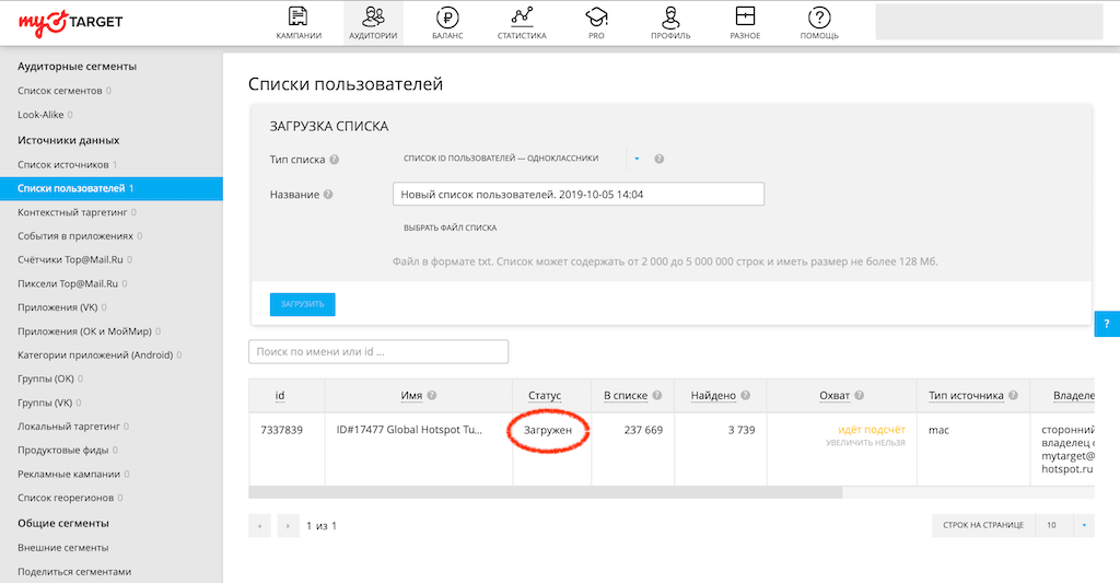 После выгрузки MAC-адресов из нашего личного кабинета в ваш аккаунт myTarget он находится в Списках пользователей.
