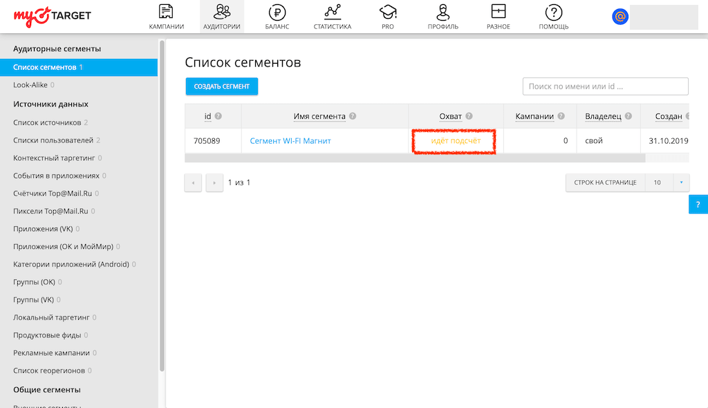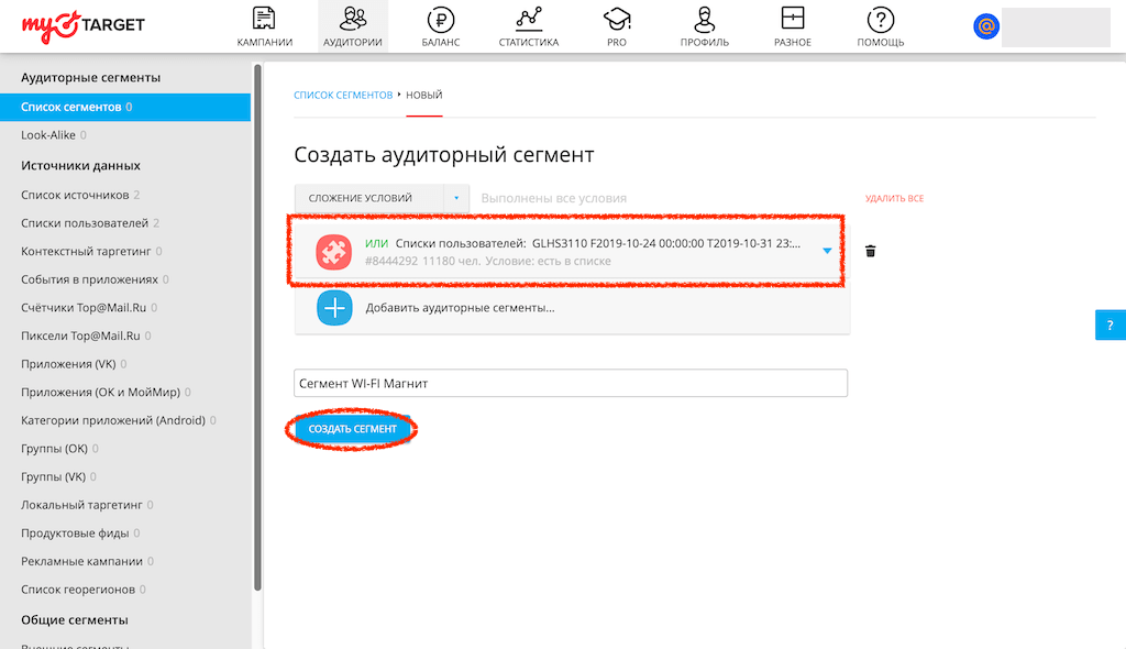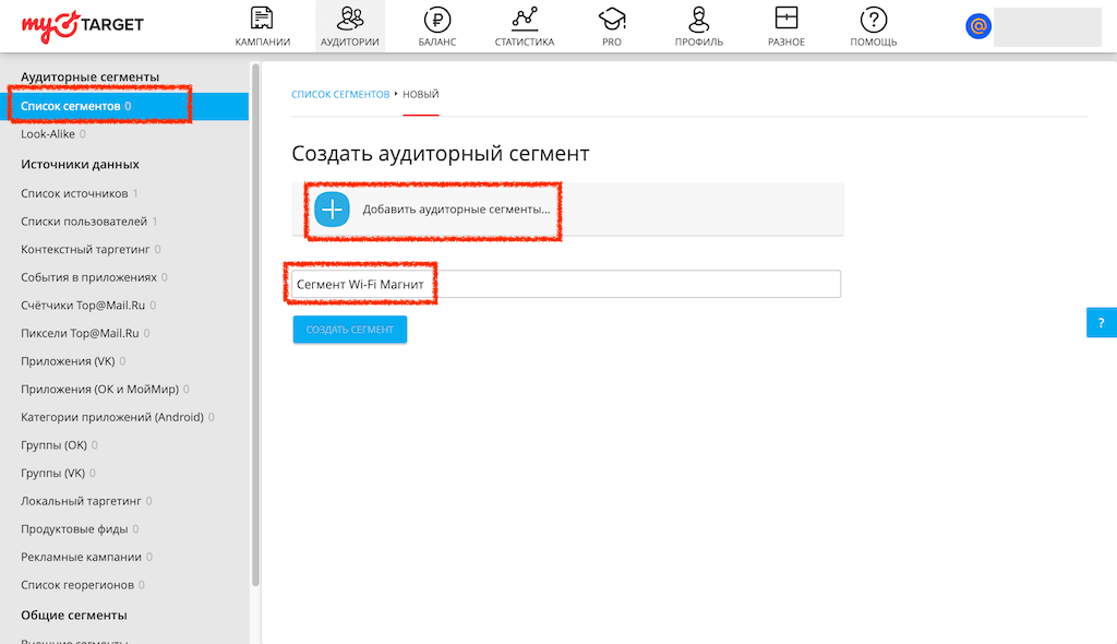 Для того, чтобы люди из этого списка увидели вашу рекламу, надо создать сегмент на основе этого списка. Переходим в Сегменты и добавляем новый сегмент. Мы назвали его “Сегмент Wi-Fi Магнит”.