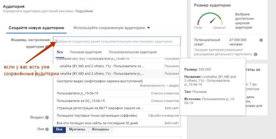 Если у вас уже есть созданные Аудитории, выберите их. Если нет — создайте новые.