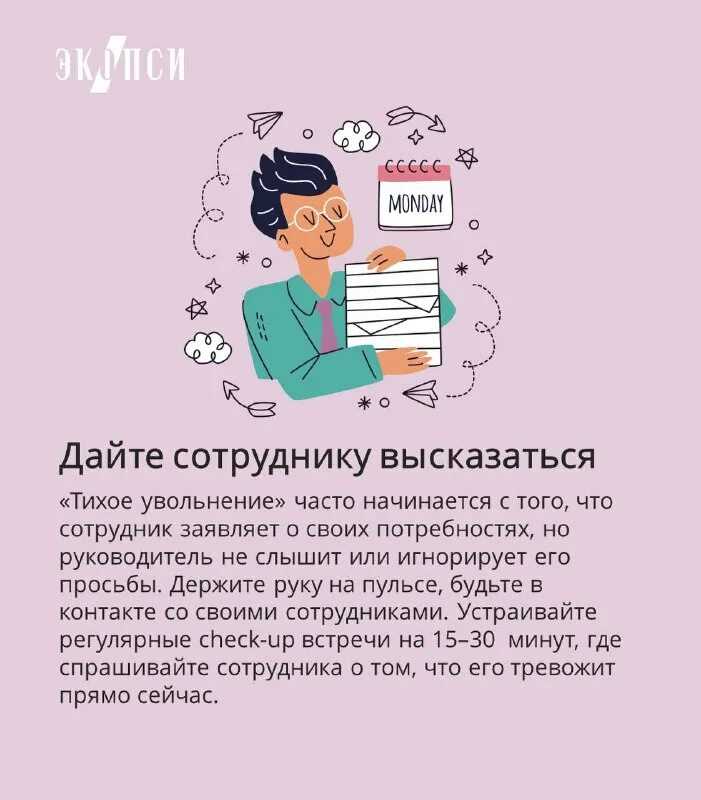 - проактивный отдых, чтобы помочь сотрудникам сохранить эмоциональную устойчивость и работоспособность, а не предлагать отпуск, когда эти показатели уже на нуле. Например, это могут быть пятницы без деловых встреч или оплачиваемые отгулы перед потенциально большой нагрузкой;