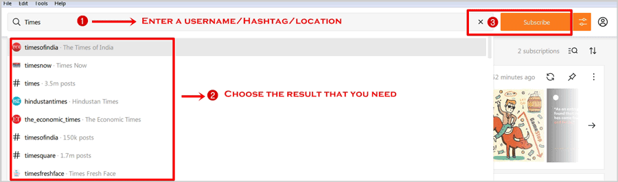 3. To subscribe to an Instagram account so that 4K Stogram downloads all of the account’s photos and videos, type the username into the search bar and press Subscribe. Do the same for hashtags.