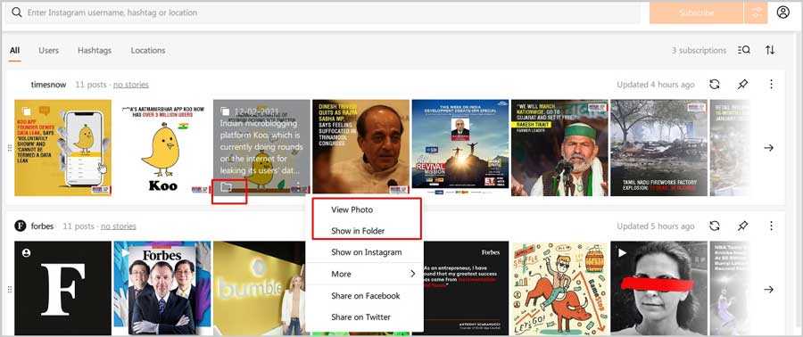 7. Once you have set up your Subscriptions (a maximum of two if you’re using the free version), you can view them on your computer by right-clicking and selecting View in Folder. You can also choose to see it online by selecting View on Instagram.