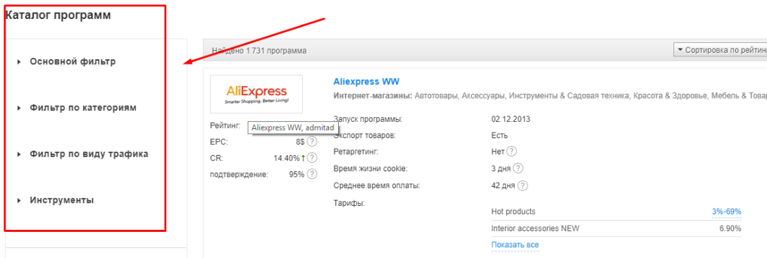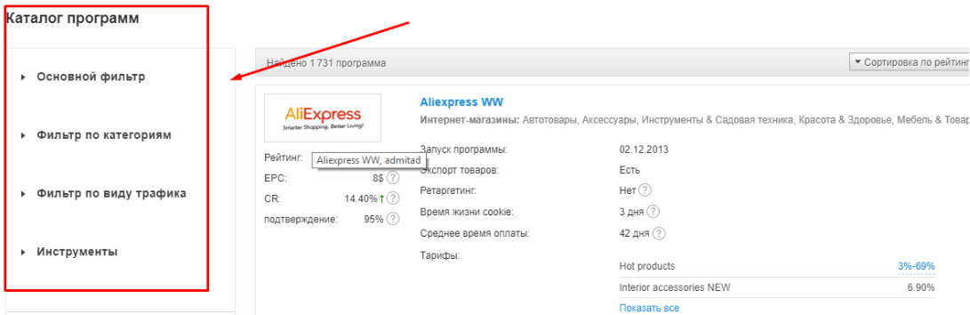 В левой части экрана вы увидите очень удобную навигацию: можно отфильтровать партнерские программы по нише, разрешенным каналам привлечения трафика, странам, наличию в программах определенных инструментов для арбитражника.