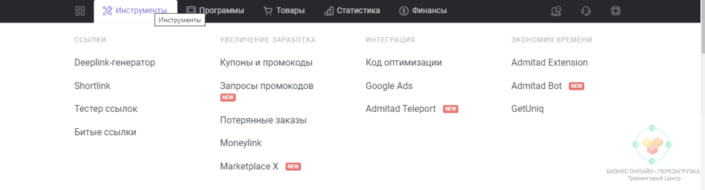 Платформа Admitad постоянно обновляет инструменты, которые могут использовать веб-мастеры. Они делятся на четыре раздела: ссылки, увеличение заработка, интеграция, экономия времени.