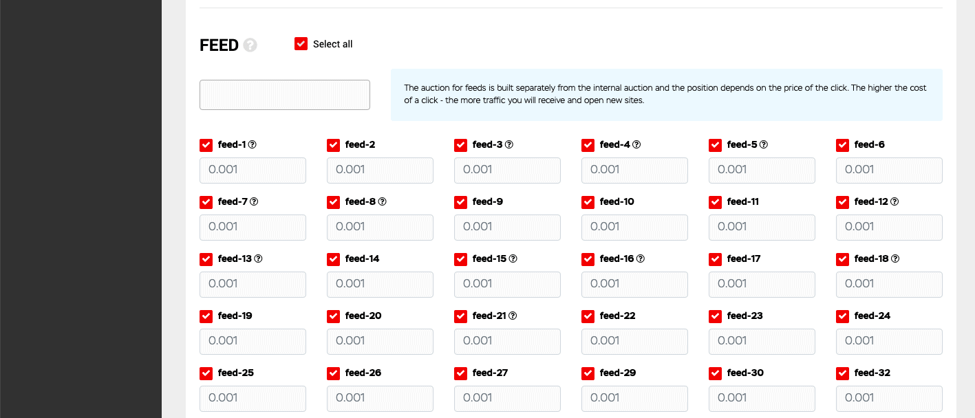 - Возможность установки стоимости клика для каждого отдельного фида.