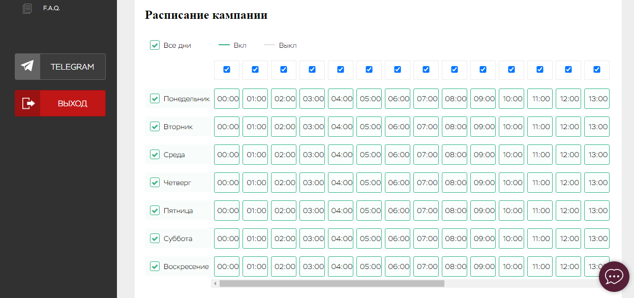 Скролим вниз и заполняем раздел с расписанием показов вашей кампании — выбираем дни недели и время показа: