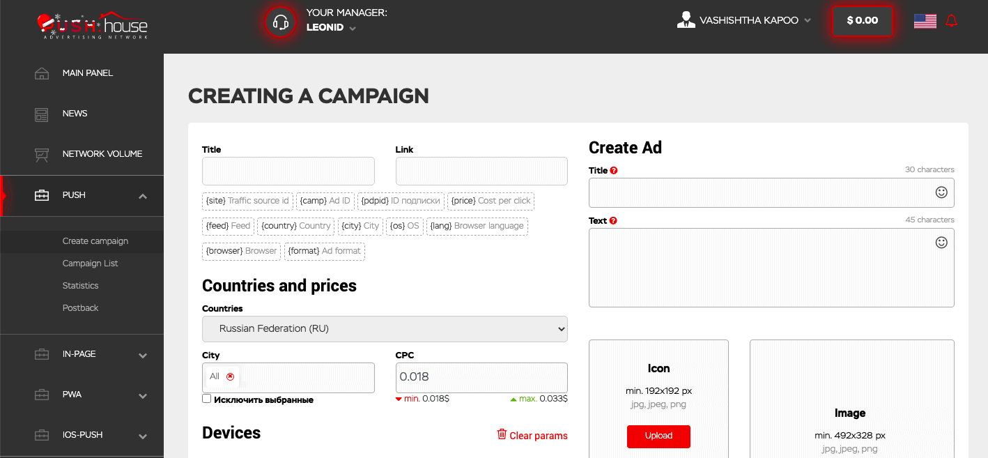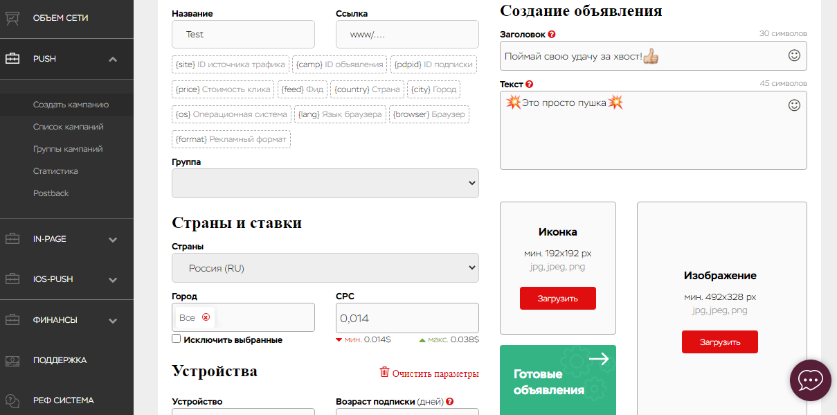 Настроить рекламу в Push.house интуитивно просто. Пробежимся по основным этапам. Жмём на “Создание кампании” и открывается окно в котором нужно заполнить поля: название объявления, вставить ссылку, написать заголовок и текст объявления, выбрать гео, (также и города, при необходимости), устройства (мобильные или десктоп).