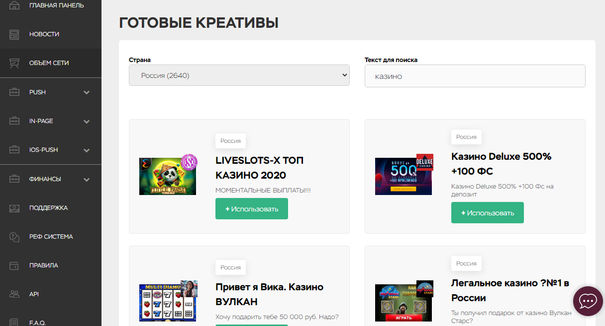 В конце обзора раскрою еще одну приятность от сетки Push.house. На странице создания объявления можно выбрать раздел “Готовые объявления” и вы попадаете во встроенный спай-сервис, где по гео и ключевым словам можете проанализировать что там льют ваши конкуренты:)