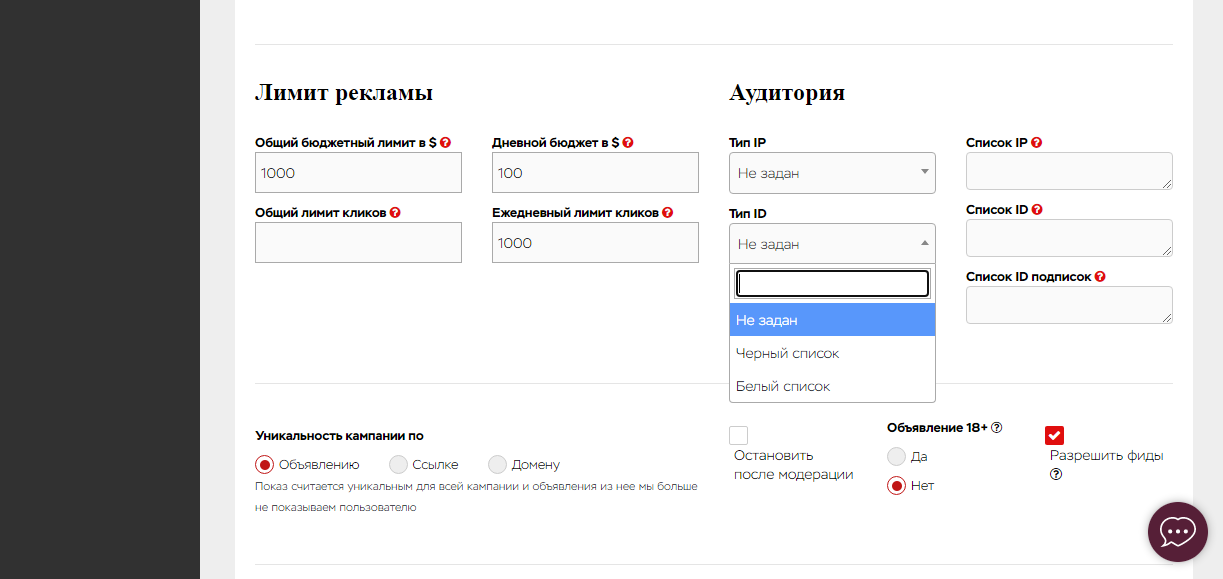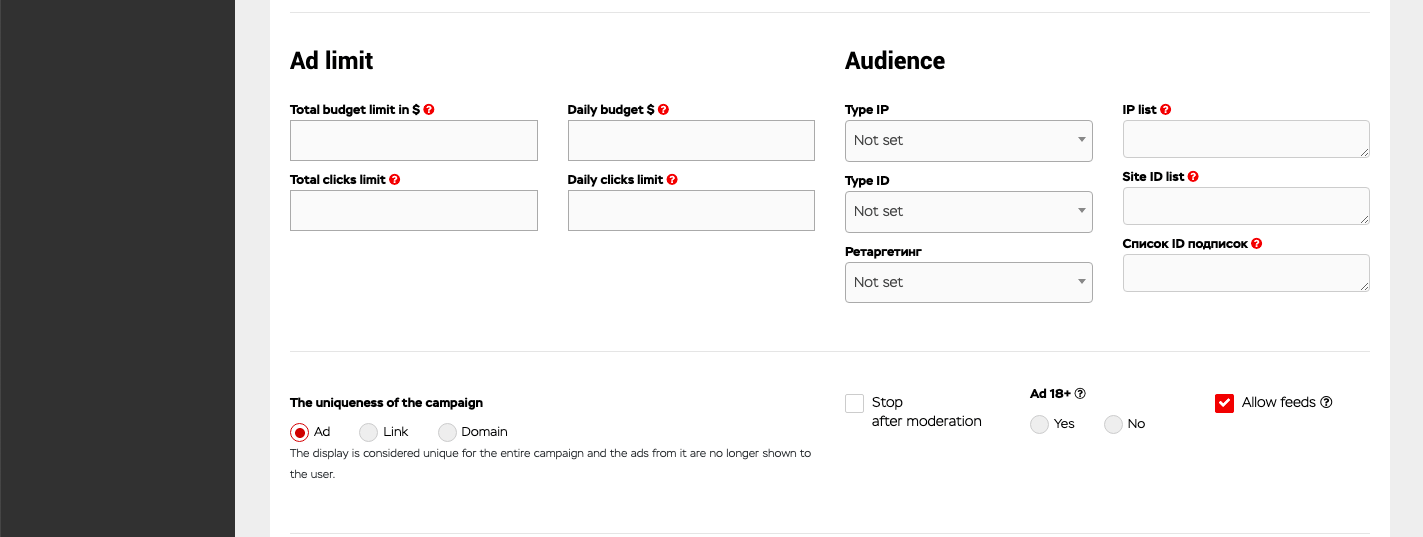 - Большой набор дополнительных настроек для управления кампанией – уникализация показов по объявлению, ссылке, домену; отключение трансляции взрослой рекламы и т.д.