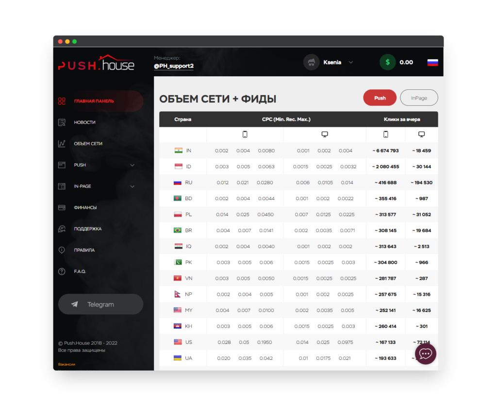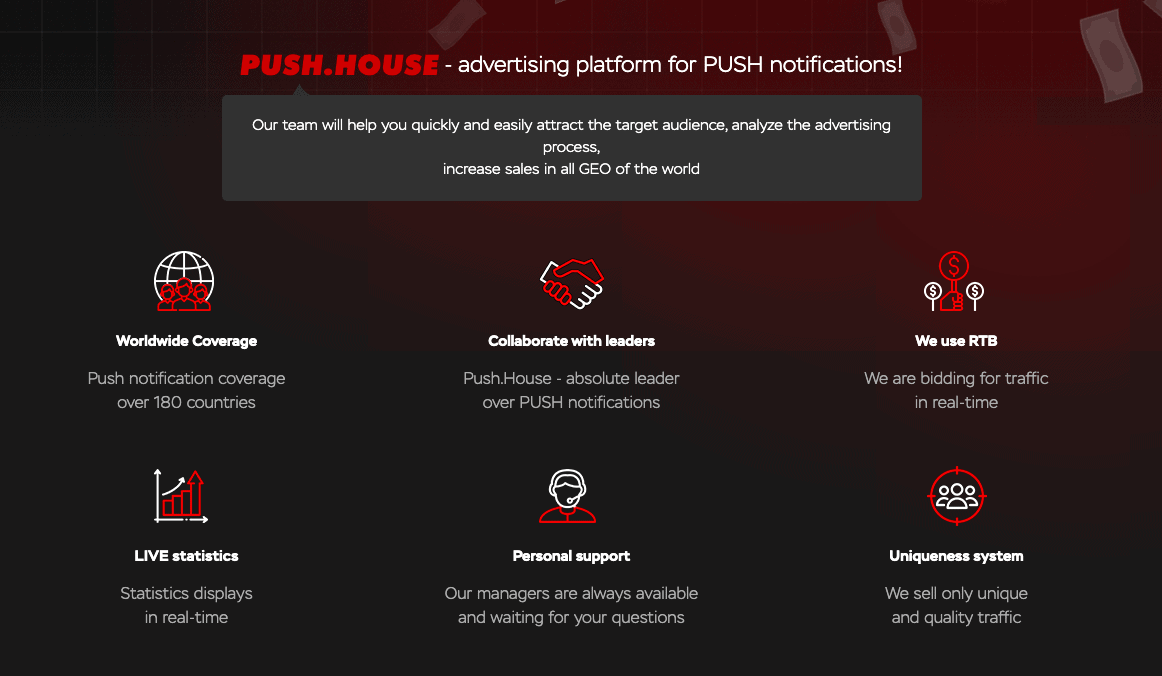 Push House может похвастаться обширной сетью и охватом, что позволяет рекламодателям и издателям общаться с аудиторией по всему миру.
