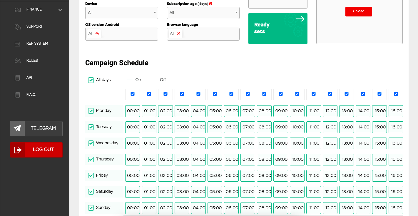 В настройках сети рекламодатель самостоятельно задает устраивающие его параметры, охват стран приближается к двум сотням, есть возможность определиться со временем показа, тематикой, устройствами, браузерами, операторами.