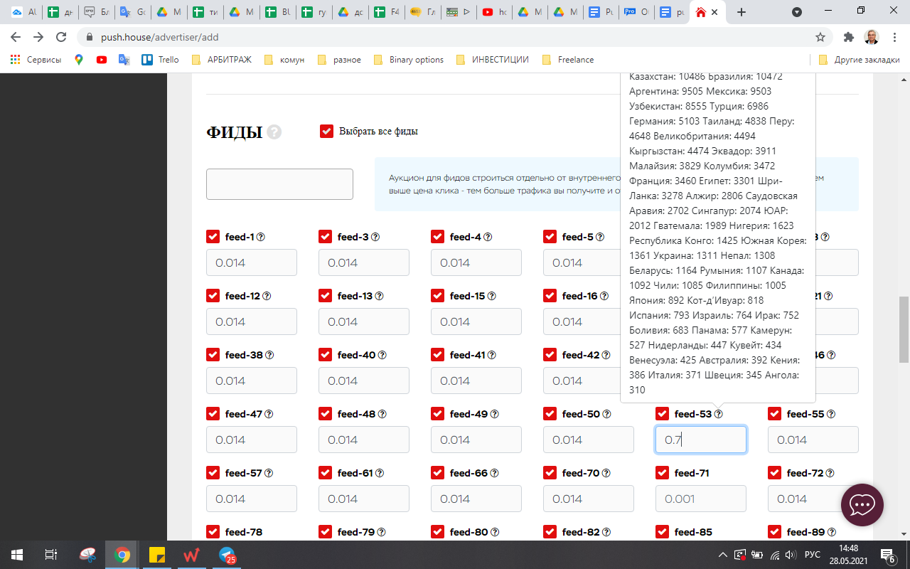 Фиды можно выбрать, как все сразу, так и отдельно, подходящие под ваши гео. Кроме того, можно выбрать отдельно цену клика для конкретного фида. А наведя курсор на знак вопрос рядом с номером фида, можно увидеть гео и показатели кликабельности по ним.