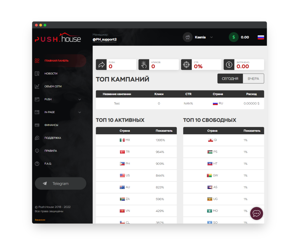 На главной панели вы сможете отслеживать число пушей, кликов, CTR и сумму потраченных денег, а так же увидите топы ваших кампаний, активных и свободных стран.