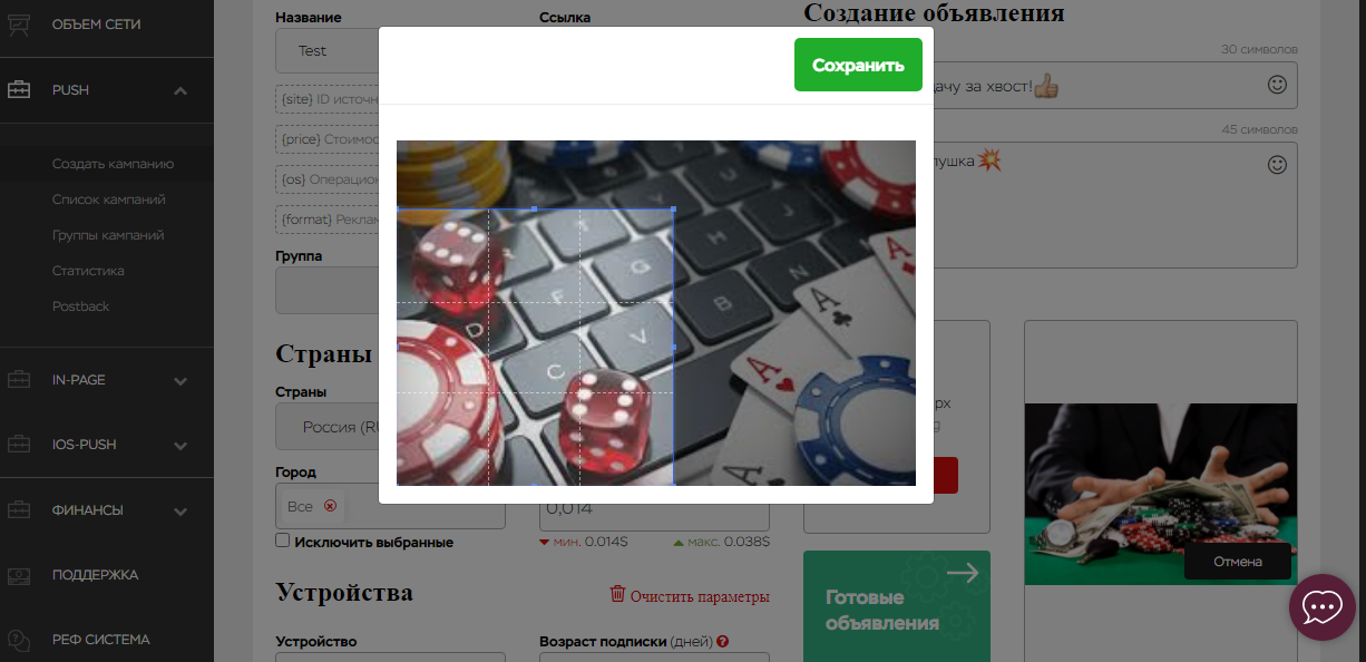 Далее загружаем фото изображения самого пуша, а также на иконку. С изображениями очень удобно работать — можно взять фото любого размера и откадрировать его прямо в окне личного кабинета: