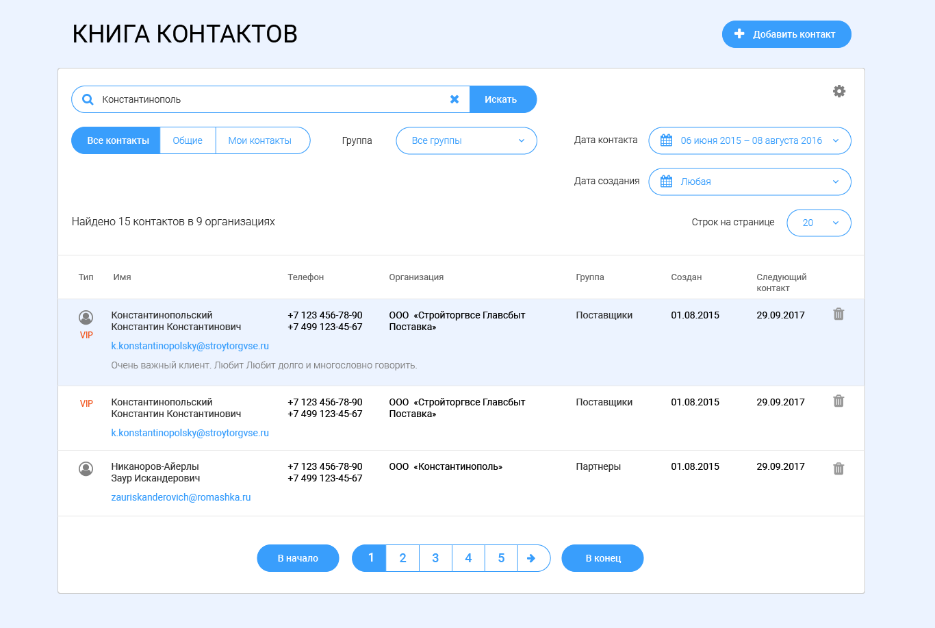 В книге контактов для каждого клиента можно оставлять комментарии, например, особые условия сотрудничества, а также указывать дату следующего контакта. Фильтр по последнему показателю позволяет сделать выборку по клиентам и сформировать список звонков на определенный период времени.