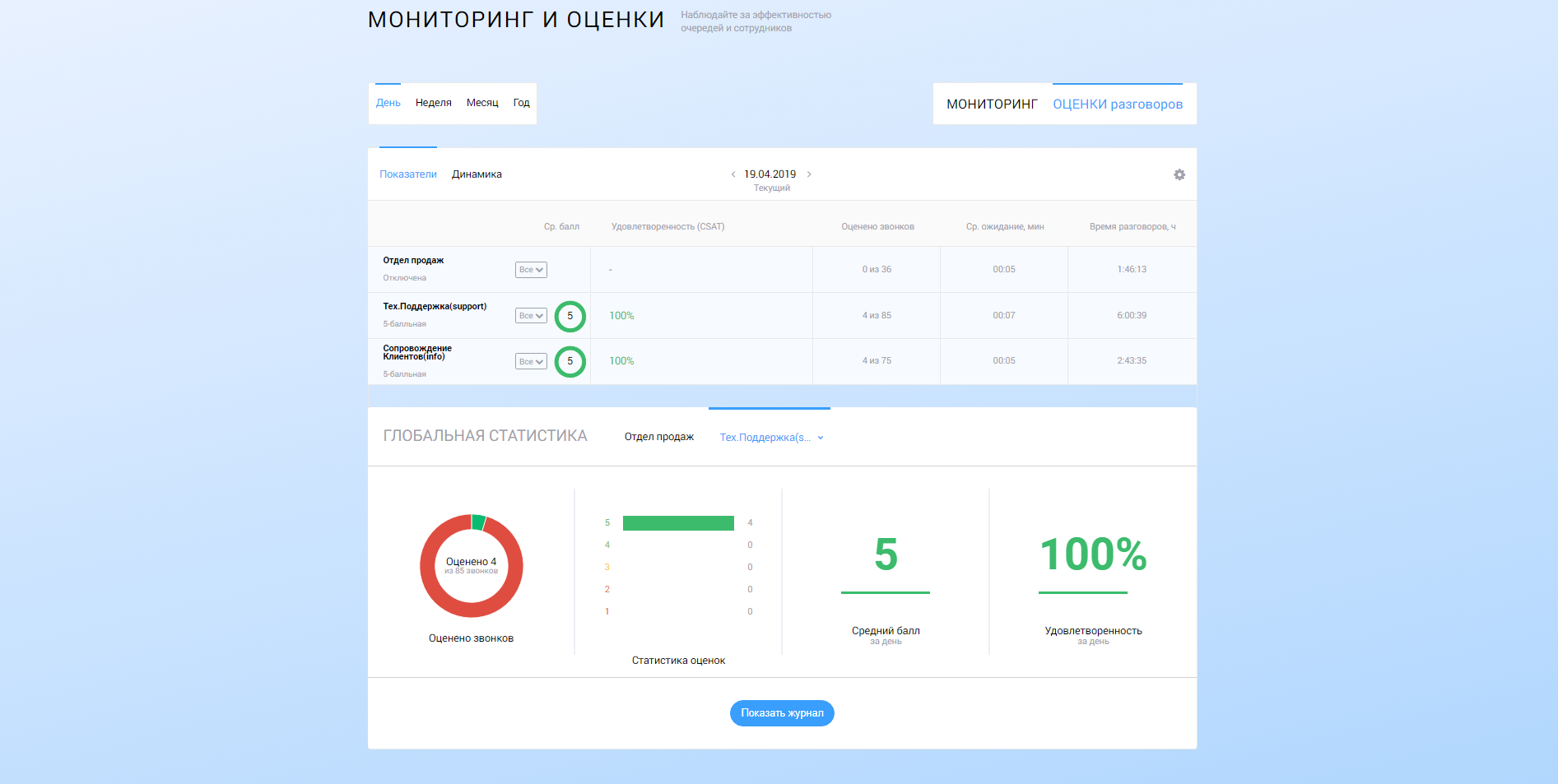 Статистику оценки разговоров можно выводить по отделам и определенным сотрудникам, различным временным периодам. Также она позволяет наглядно оценить средние показатели времени ожидания на линии, продолжительность разговоров, а также средний балл оценки и индекс удовлетворенности клиентов.