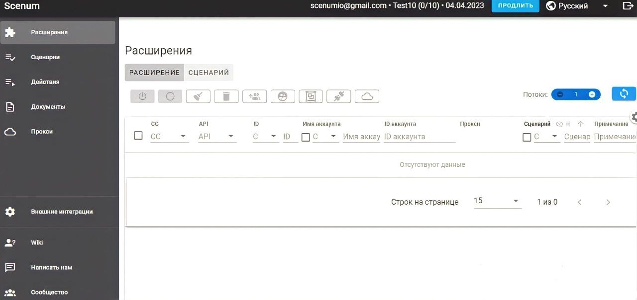 После этих действий можете запустить сценарий из личного кабинета Scenum и оттуда одним кликом сможете управлять абсолютно всеми расширениями. При нажатии старт/стоп профили антидетект браузера самостоятельно будут открыться и закрыться. И все сохраненные сценарии могут выполняться выбранным вами количеством профилей.