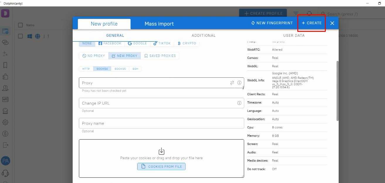 - Нажмите кнопку «Create», чтобы создать профиль с настроенным прокси.