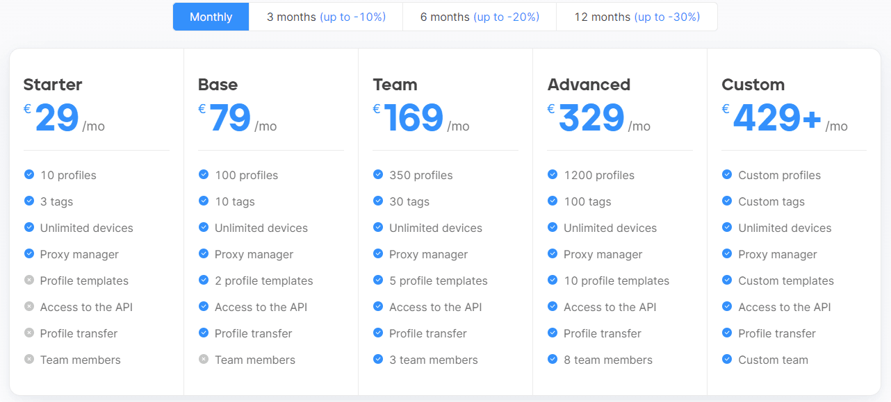 Первый платный тариф Окто (Starter, 10 профилей) обойдется вам в €29 (3000₽) в месяц. На этом тарифе, грубо говоря, почти ничего нельзя. Все функции настолько ограничены, что мы не можем рассматривать этот тариф как вариант для какой-либо работы. Он подойдёт только для нужд личной анонимности.