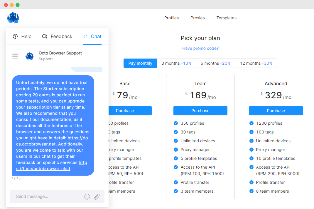 Важный момент для большого числа пользователей: Окто не предлагает ни бесплатный тариф, ни пробный период. Потестировать Окто браузер бесплатно не получится. Чтобы посмотреть, как работает Окто, придётся заплатить минимум 29 евро и всё равно столкнуться с кучей ограничений.