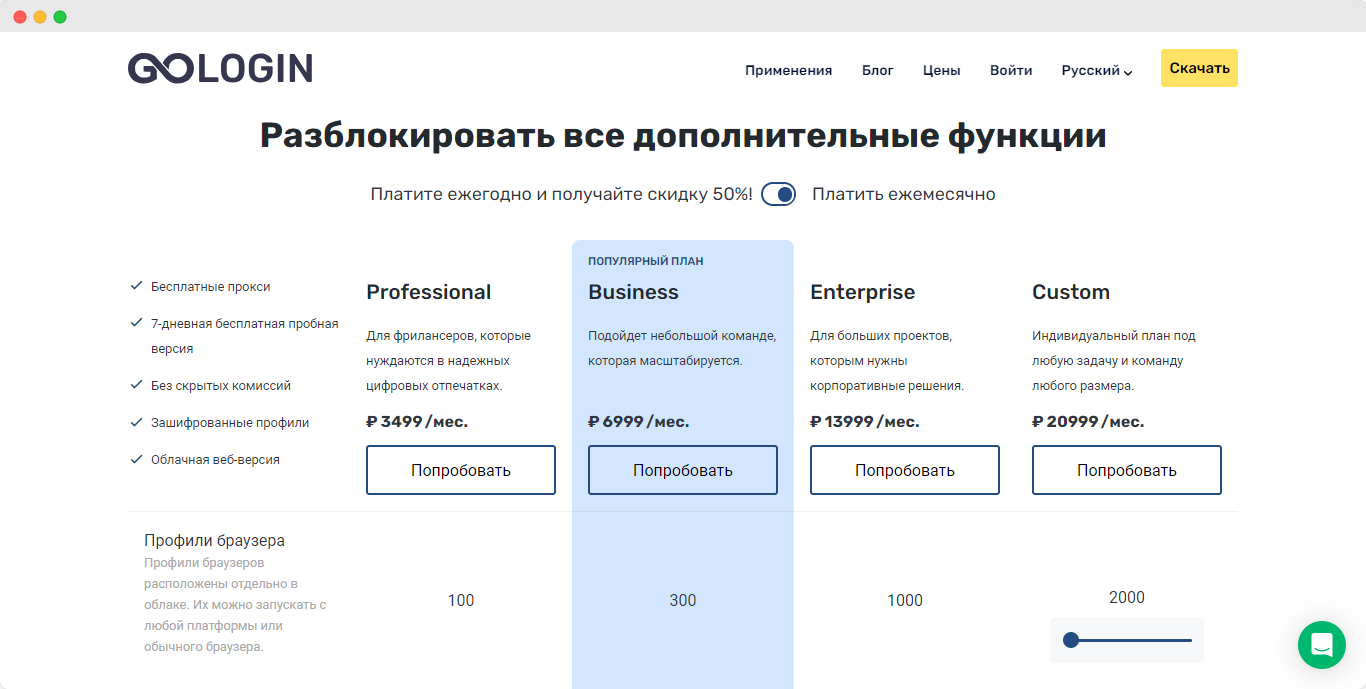 Цены и тарифы GoLogin