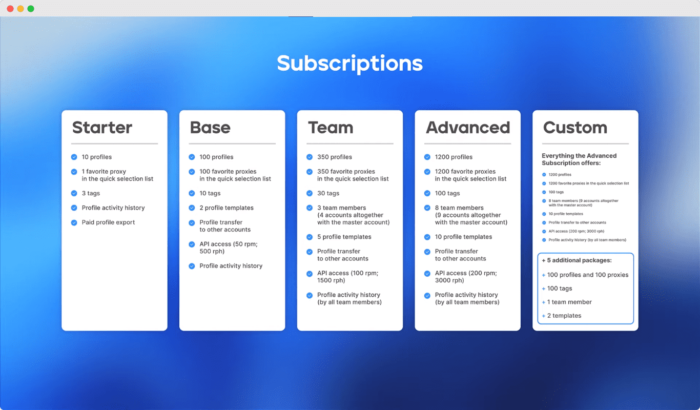 Все тарифные планы включают полный набор функций, в том числе менеджер прокси, браузерных расширений, закладок и быстрых страниц, конструктор автоматизации и управление командой.