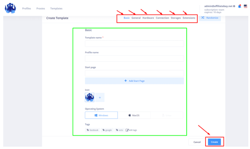 Теперь у нас остались шаблоны Octo Browser. Нажмите «Шаблоны», затем «Создать шаблоны».