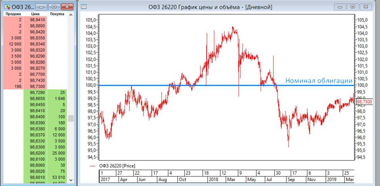 На картинке ниже — стакан заявок и котировки ОФЗ-26220. За два года цена облигации колебалась в диапазоне 4-5% от номинала.