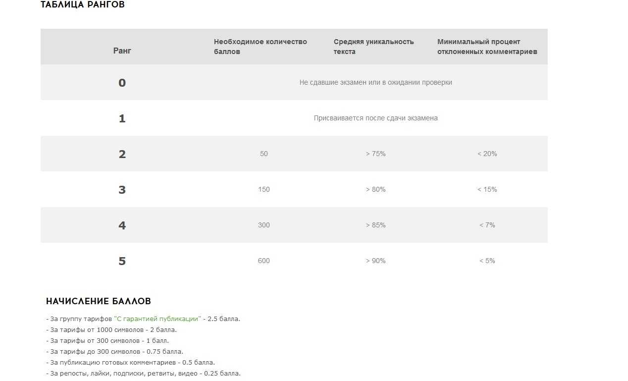 - Третий ранг откроется после накопления 150 баллов, уникальность текстов должна быть выше 80%, а количество отклоненный заданий менее 15%;