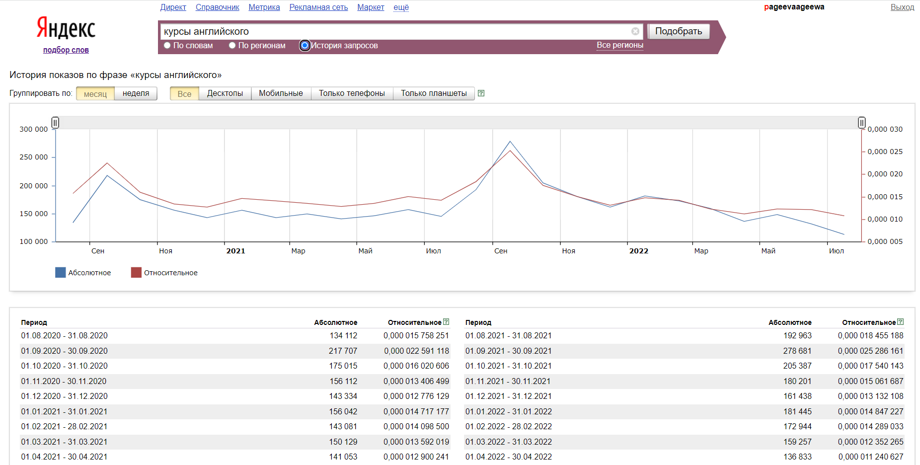 Статистику можно смотреть в абсолютных или относительных значениях. Для получения относительного значения абсолютная цифра нормируется на количество показов результатов поиска Яндекса за соответствующий месяц.